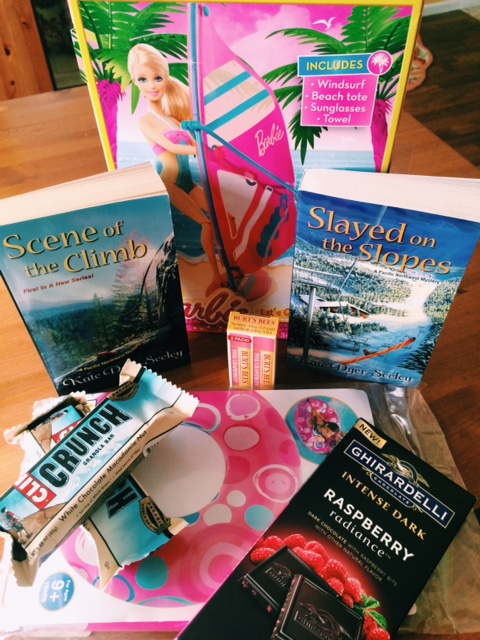 Signed copies of Scene of the Climb and Slayed on the Slopes, Windsurfing Barbie kit,  Pink inflatable pool float, Clif bars, Burt’s Bees Pink Grapefruit lip balm, Ghiradelli Dark Chocolate bar with raspberry
